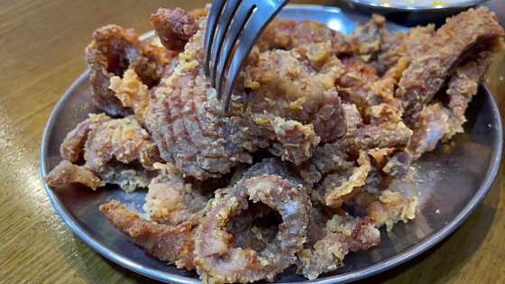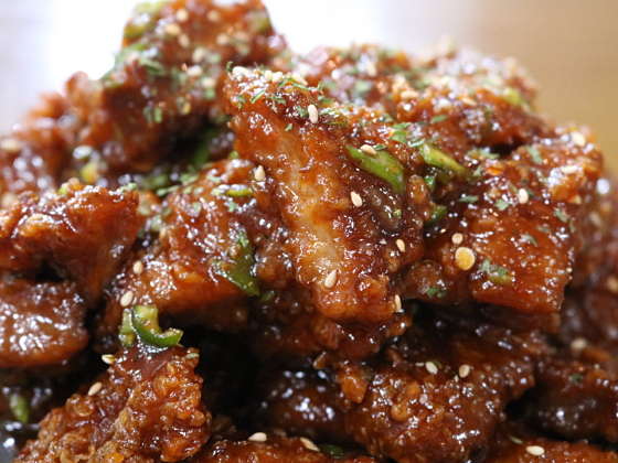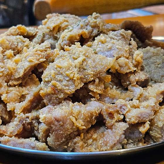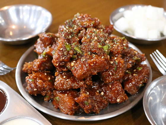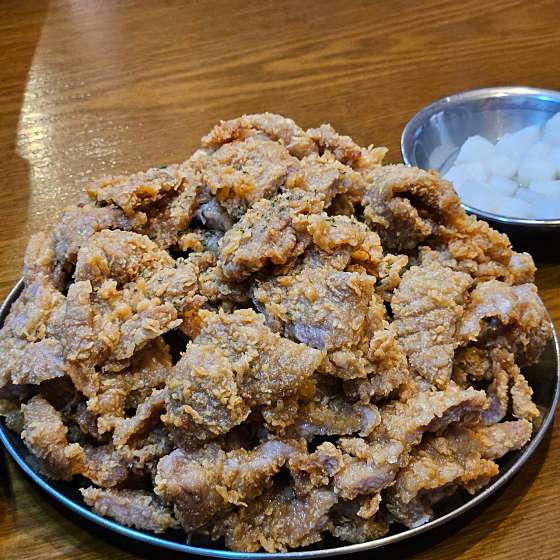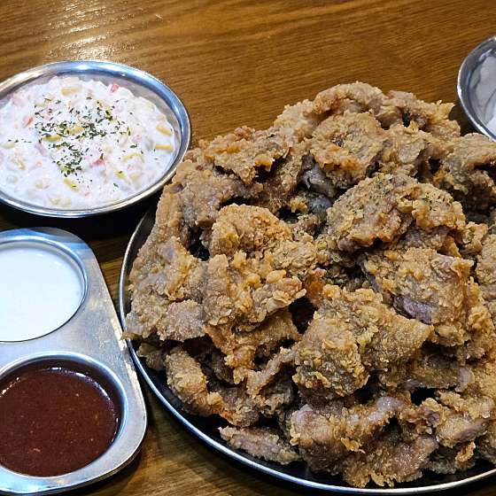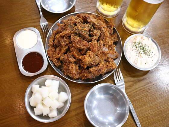 맛이 궁금했었는데 돼지갈비를 치킨반죽에 튀겨놓은 맛이네요. 부드럽고 달달한 맛이나는 고기에 바삭한 튀김의 식감이 매력적입니다. 매장에서 파는 생맥주와 함께 하면 더욱 좋을듯 싶습니다. 포장 손님이 많아서인지 음식 나오는 속도는 조금 걸리는 편이며, 비계가 많은 부위에서는 드물게 돼지고기 잡내도 났었어서 이부분은 조금 아쉬웠네요. 메뉴의 참신함과 밥반찬으로도 잘 어울렸던 점은 좋았습니다