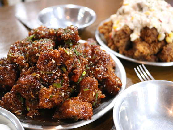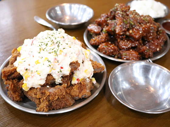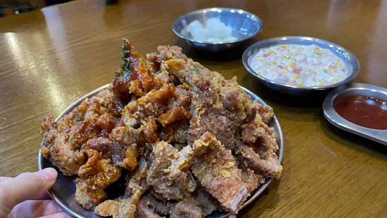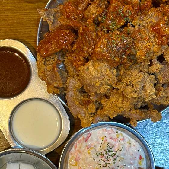 쓰가의 도시 푸싼에서 새롭게 뜨는 명물 아임니까. 양념은 3분카레급으로 눅눅해지므로 후라이드로만 포장해서 찍먹 춪쳔ㅋ 돼.갈 반반 중 후라이드 양념 , 콘샐러드 돼지 갈비부위라 부드럽고 맛있는데 먹다보면 물려요. 맥주랑 술안주처럼 먹거나 포장해서 집이나 숙소에서 두고 먹기 좋을 거 같아요. 내부가 협소해서 웨이팅 필수일 거 같습니다. 콘샐러드는 물리는 돼지갈비 먹을 때 새로운 변주를 주는 느낌은 아닌 거 같아요.. 음료나 술이 필수인 맛입니다.