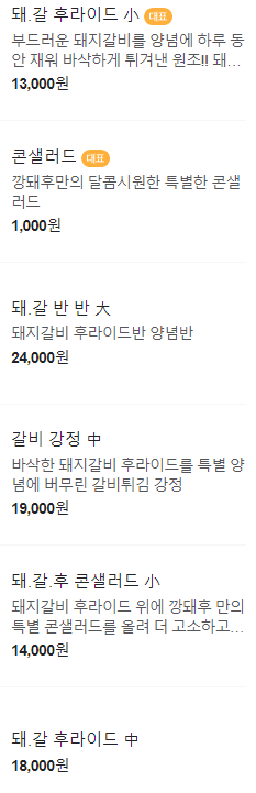 차림표를 보니 돼.갈 후라이드 小, 콘샐러드, 돼.갈 반 반 大, 갈비 강정 中, 돼.갈.후 콘샐러드 小, 돼.갈 후라이드 中, 돼.갈 후라이드 大 등이 있네요.