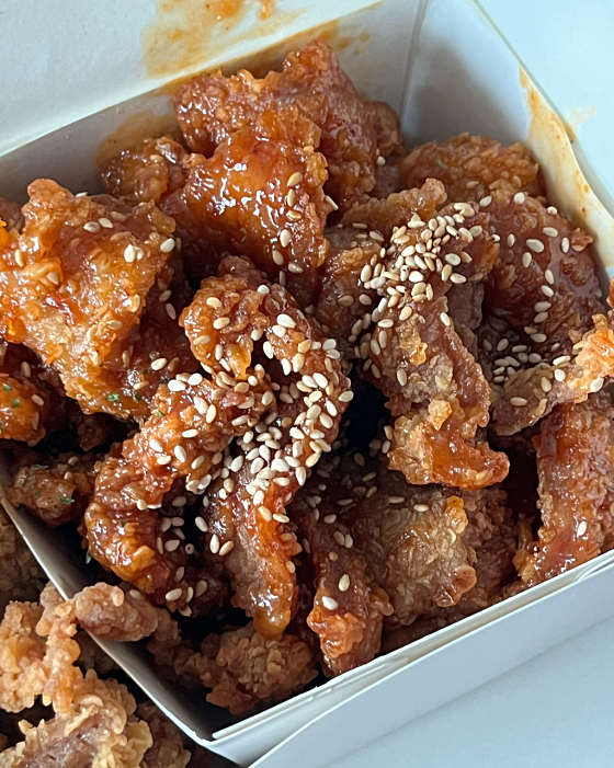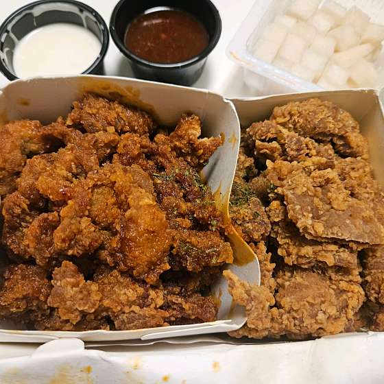 포장 주문 15분정도 걸려요. 연휴껴서 사람 바글바글 이미 먹어봐서 맛있는거 알았는데 직접 가서 먹는게 더 뜨끈하고 콘솔로우 위에 뿌려먹으면 미친맛임. 돼지고기가 연하고 육즙이 촥촥 살아있으며, 후라이드에 쏘스 찍어먹는게 진짜 별미 양념파는 양념 선호. 닭강정보다 부드럽고 남포동 깡통시장 별미 뷰산에 오면 꼭 먹어봐야함. 별
