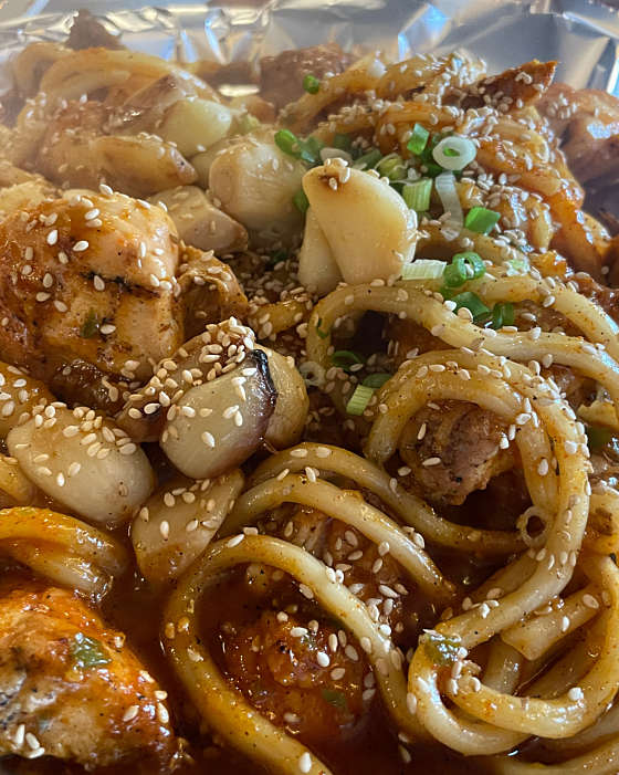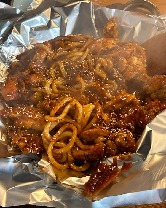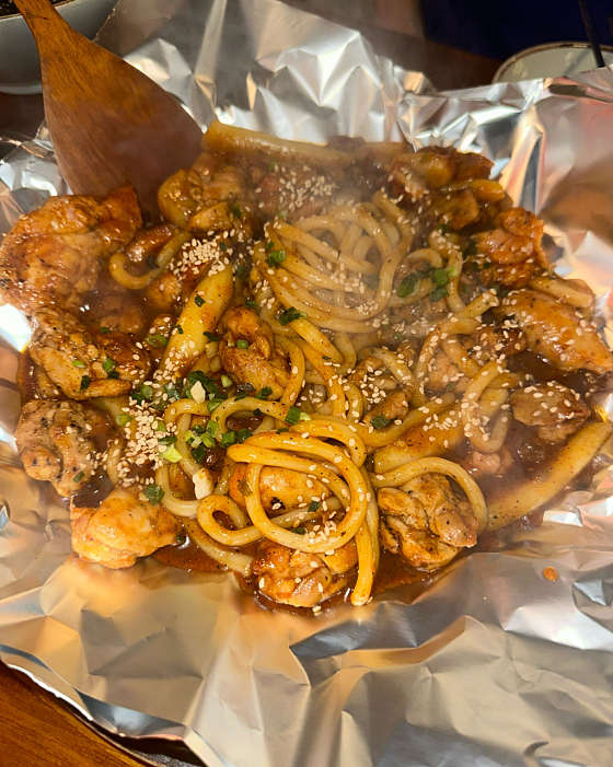 매콤한 숯불바베큐가 땡겼는데 매운맛이 확실히 매콤하더라구요 !!! 우동사리 추가는 필수 입니닷 ㅎㅎ 왕십리 왕초바베큐 본점인데 그만큼 제대로 먹고왔어요 셀프주먹밥도 참기름 꼬수해서 추천 !! 닭도 뻑뻑하지않고 부드러워요 ! 성동구청맛집 찾다가 가게됐는데 인테리어도 힙하고 음식도 넘 맛있게 먹고왔어요 돌판위에 올려져서 따끈하게 먹을 수 있었습니다, 양념이 자박하게 있어서 우동사리나 밥이랑 같이 비벼서 먹으면 딱이더라구요!! 맵기는 보통맛으로 시켰는데 신라면정도의 맵기여서 딱 맛있게 먹을수 있는 맵기였습니다!! 바베큐 안에는 통마늘이 들어가있는데 마늘향이 양념에 은은하게 배여있어서 달큰한 맛이 맛있는거 같아요ㅎㅎ 뜨거운 돌판 위에서 계속 양념이 졸여지는데 후반에는 졸여진대로 또 맛있었습니다