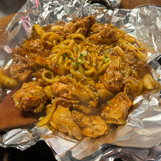 숯불맛 가득 나는 양념 치킨 바베큐 진짜 맛있어요 ! 돌판에 올려주셔서 먹는 내내 지글지글 끓어서 따뜻하게 먹을 수 있어요 우동이랑 치즈랑 꼭 추가해서 드세요 ! 마지막 볶음밥까지 넘 맛있게 먹었어요 진짜 왕십리 치킨 맛집이에용!!