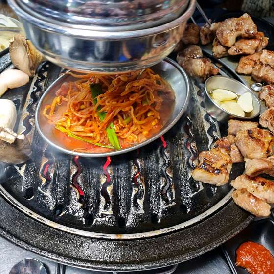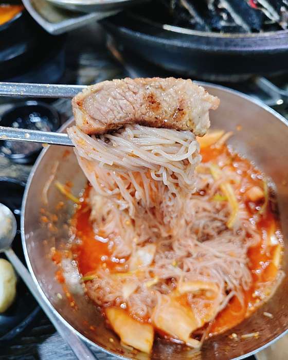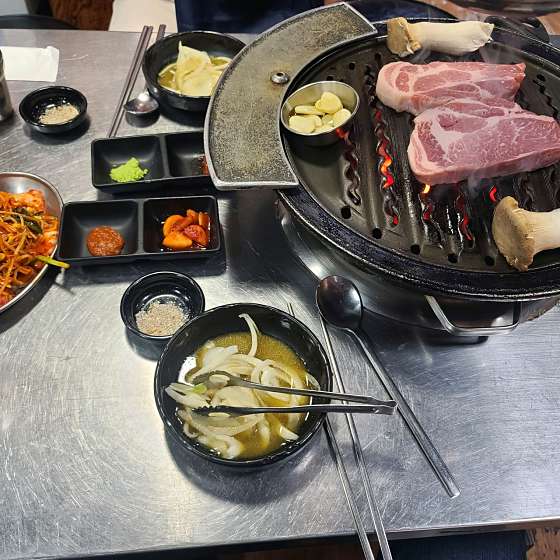 고기 맛있어요 저 두꺼운고기를 빨리빨리 잘구워주십니다 빨리먹을수있어 조음 라면도 시켜먹었는데 진짜 맛있어여 근데 맵찔은 한입먹고못먹더라구요 전 맵찝아니라서 아주 맛있게 잘먹었습니다 ! 사람이 너무많아서 좀 정신없긴한데 맛 최고