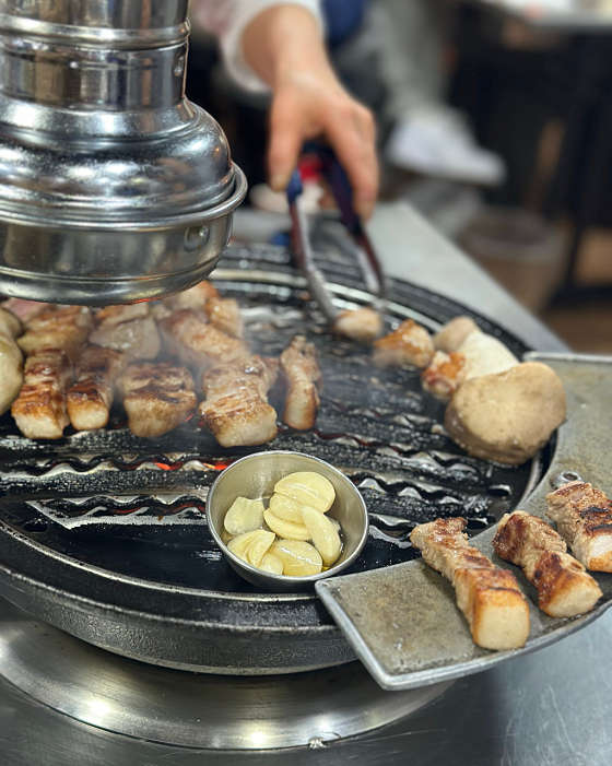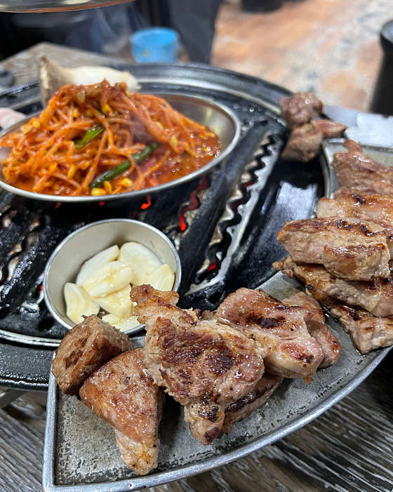 2년만에 방문했지만 특유의 고소한 맛은 여전함! 옆에 콩나물 무침 매우 맛있음 역시 3대 목살집 다움! 오후 2시에 시작이라 1시 55분에 가보면 이전부터 대기 줄 있습니다. 45분까지 가는 게 좋을 거 같아요. 회전율이 빨라 밑반찬이 신선할 거라 기대했는데 그러진 않았습니다. 직원분들이 정말 능숙하게 구워주는 고깃집입니다. 불판에 기름이 고이지 않아 담백합니다. 삼겹살, 목살, 갈매기살 다 먹었는데 갈매기살이 가장 맛있네요. 김치, 콩나물 마늘은 따로 기름에 담긴 용기로 볶아주셔서 신기했습니다. 비냉 맛있어요.