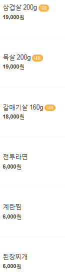차림표를 보니 삼겹살 200g, 목살 200g, 갈매기살 160g, 전투라면, 계란찜, 된장찌개, 물(비)냉면 등이 있네요.