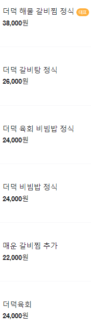 차림표를 보니 더덕 해물 갈비찜 정식, 더덕 갈비탕 정식, 더덕 육회 비빔밥 정식, 더덕 비빔밥 정식, 매운 갈비찜 추가, 더덕육회 등이 있네요.