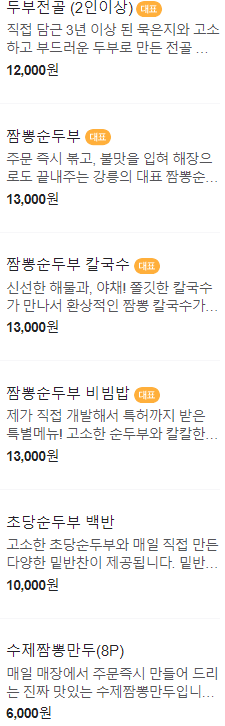 차림표를 보니 두부전골 (2인이상), 짬뽕순두부, 짬뽕순두부 칼국수, 짬뽕순두부 비빔밥, 초당순두부 백반, 수제짬뽕만두(8P), 모두부 한 모, 모두부 반모, 초당의아침 (콩물음료), 메밀꽃동동주, 옥수수동동주, 소주,맥주, 음료수 등이 있네요.