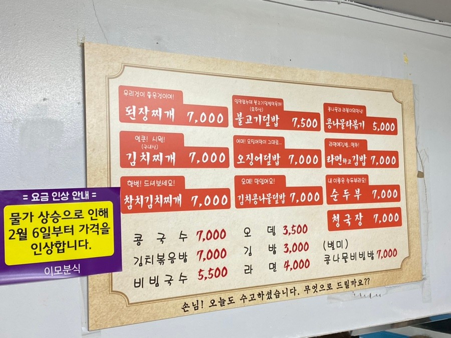 차림표를 보니 된장찌개, 김치찌개, 김치참치찌개, 불고기덮밥, 오징어덮밥 등이 있네요.