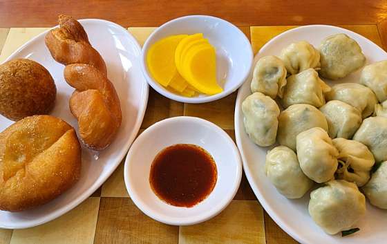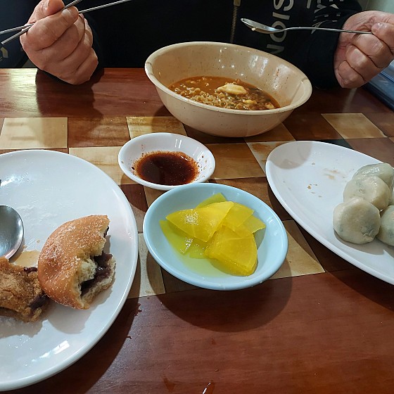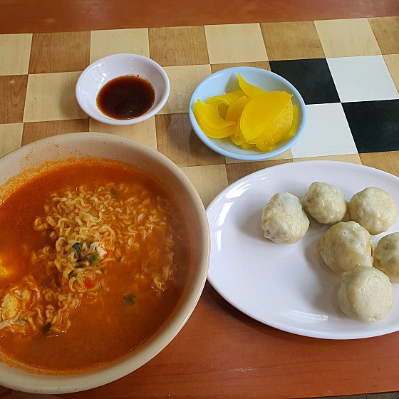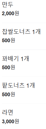 차림표를 보니 만두, 찹쌀도너츠 1개, 꽈배기 1개, 팥도너츠 1개, 라면 등이 있네요.