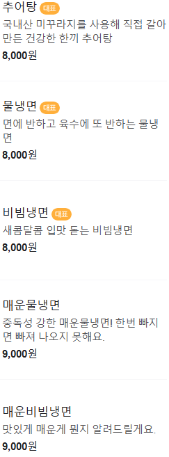 차림표를 보니 추어탕, 물냉면, 비빔냉면, 매운물냉면, 매운비빔냉면, 물냉면곱배기, 비빔냉면 곱배기, 고기만두, 떡만두국, 사골 손 칼만두, 사골 손 칼국수 등이 있네요.