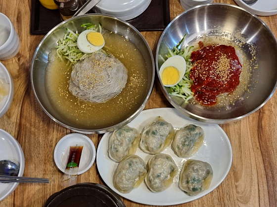 냉면먹고 해장하고왔어요 비빔냉면이랑 물냉면 시켰는데 매운냉면이 따로 있어서 그런지 보통의 비빔냉면은 맵지 않아서 매운걸 잘 못먹는 남편도 맛있게 먹었어요! 면도 직접 뽑아서 보들보들하고 육수도 시원하니 너무 맛있었어요!! 수제만두도 짜지않고 간이 슴슴해서 제 입맛에 딱이었어요. 광명시장맛집답게 여러모로 마음에 드는 가게네요! 가격도 착해서 올 여름 냉면 생각날때마다 오려고합니다 ㅎㅎ