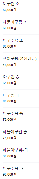 차림표를 보니 아구찜 소, 해물아구찜 소, 아구수육 소, 생아구탕(점심메뉴), 아구찜 중, 아구찜 대, 아구수육 중, 해물아구찜 중, 해물아구찜- 대, 아구수육-대 등이 있네요.