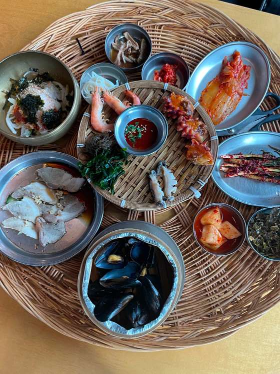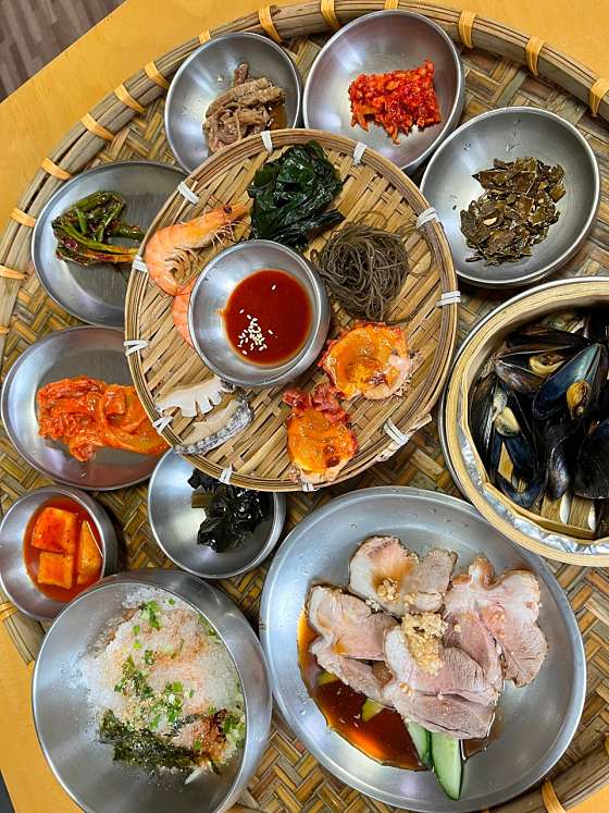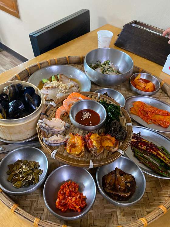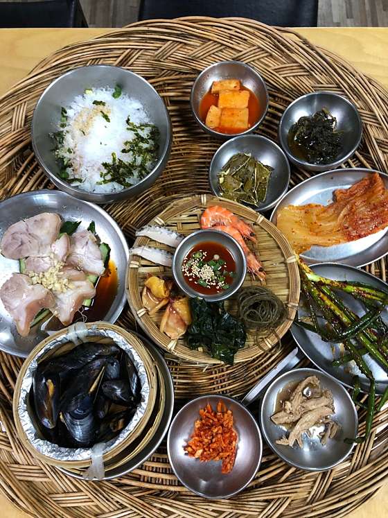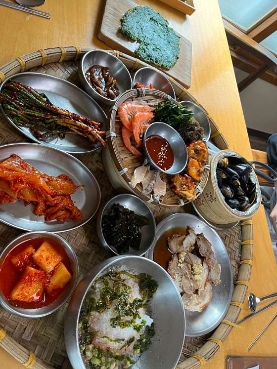차 없이 가려면 택시타세요 걸어서는 어려워요 ㅎㅎ 기장끝집 가는길이 드라이브코스네요 바다가 보이는 풍경을 보며 가니 금방도착 식당에서는 바다가 보이진않지만 바로앞이라 밥먹고 나오는 길이 예뻤어요 식전에 부쳐먹는 메생이? 파래?전은 깜짝놀랄정도로 맛있고, 음식도 깔끔했어요 ㅎㅎ 양도 딱 정당하구, 반찬은 전반적으로 찬 음식이라 많이 못먹었어요 ㅎㅎ