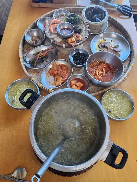 아점으로 호로록 호로록 속 따뜻하게 먹기 너무 좋아요ㅠㅠ 할머니랑 엄마랑 같이 왔는데 너무 좋아하셨어요 ! 아침에 간단히? 속 따뜻하게 너무 맛있게 드셨다구요 ㅎㅎ 전복도 꽤 많이 들어있고 양도 엄청 많아요 !! 반찬도 맛있고 해산물이 진짜 엄청 싱싱해요오!!! 파래전은 제가 부쳤어요 아주 야무지게 ㅎㅎ 노릇노릇 부쳐야 맛있대서 노릇노릇 부쳤습니당 아점으로 속 따뜻하게 호로록하기 너무 좋았습니다