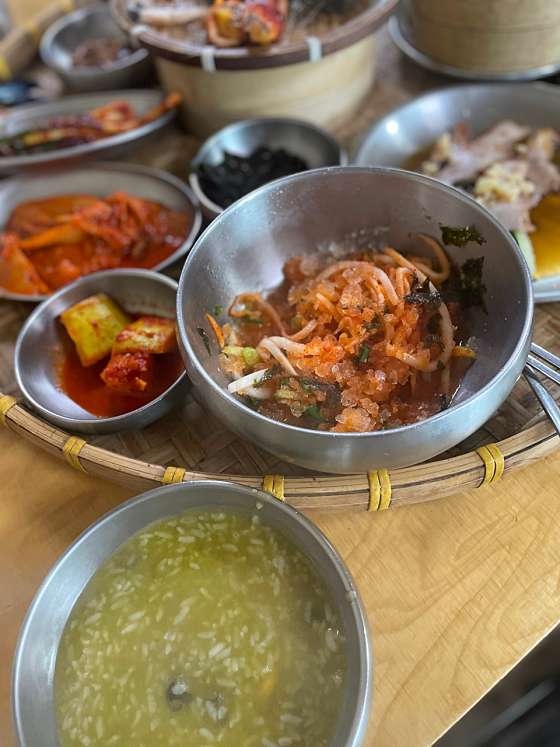 여태까지 제가 먹은 전복죽은...전복죽 아니였네요. 입구부터 전복 냄새가 장난이 아닙니다. 죽에서 풍미가 넘쳐 흘러요. 그건 그렇고 밑반찬이 모조리 맛있습니다!!! 족발?과 회무침? 진짜 맛있어요!!!!